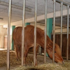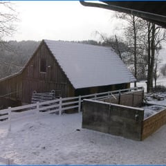 Vorher ein dunkler Kuhstall mit Schweinebuchten auf einer Seite, jetzt ein luftiger heller Offenstall mit Fressgittern und beheizten Selbstränken. Integriert sind 2 riesige Pferdeboxen. Die Luftqualität ist durch Ventilatoren einwandfrei und der Stall ist absolut frei von Insekten. Den Pferden gefällts denn sie liegen sehr viel hier. Direkt vom Stall geht’s in den Aussenpaddock und von dort auf die riesigen Weiden.
